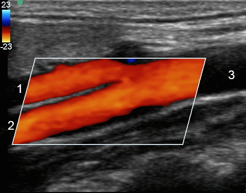 Bifurcación carotídea con color Arteria carótida externa (ACE) Arteria carótida interna (ACI) Arteria carótida primitiva
