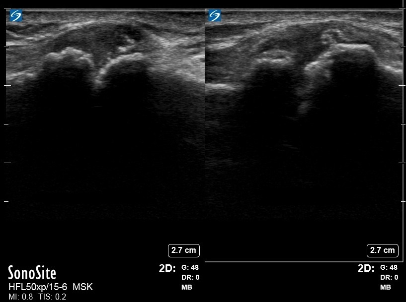 Imagen dinámica de la articulación AAC osteoartrítica del hombro Izquierda: Compresión Derecha: Neutro