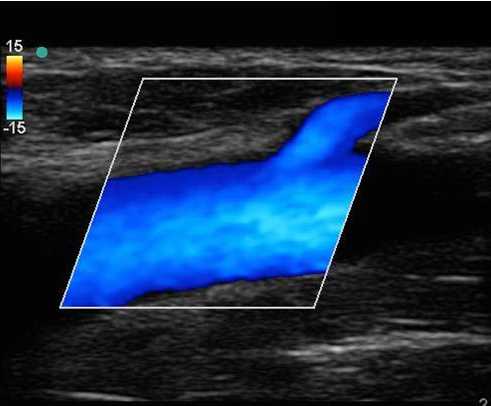 Imagen en color de trombosis venosa profunda en la porción proximal de la vena femoral