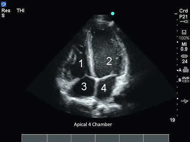 M-Turbo: Imagen apical de 4 cámaras M-Turbo: Apical de 4 cámaras Ventrículo derecho (VD) Ventrículo izquierdo (VI) Aurícula derecha (AD) Aurícula izquierda (AI)