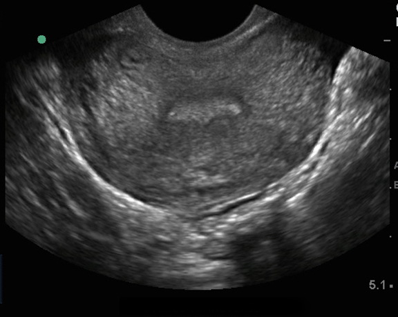 Image : Échographie pelvienne endovaginale, coupe transverse de l'utérus Coupe transverse de l'utérus