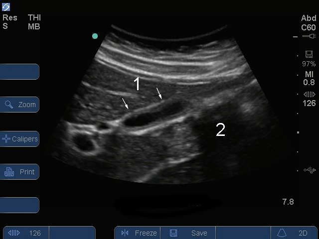 Image postprandiale - Vue longitudinale de la vésicule biliaire S Series : Postprandial - Vue longitudinale de la vésicule biliaire Vésicule biliaire postprandiale Gaz dans les intestins