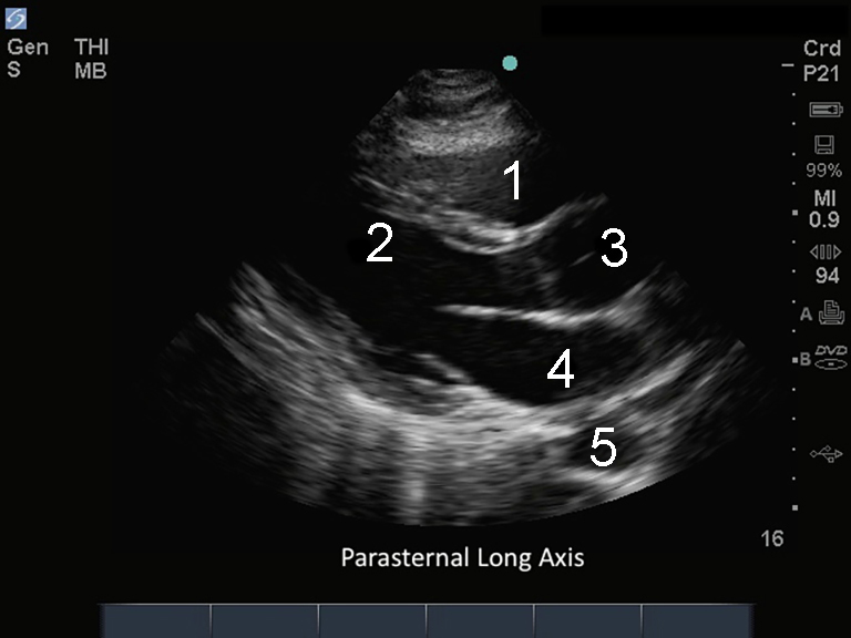 M-Turbo : Image - Axe long parasternal (PLAX) M-Turbo : Axe longitudinal parasternal Ventricule droit (VD) Ventricule gauche (VG) Aorte (Ao) ascendante • Oreillette gauche (OG) Aorte (Ao) descendante